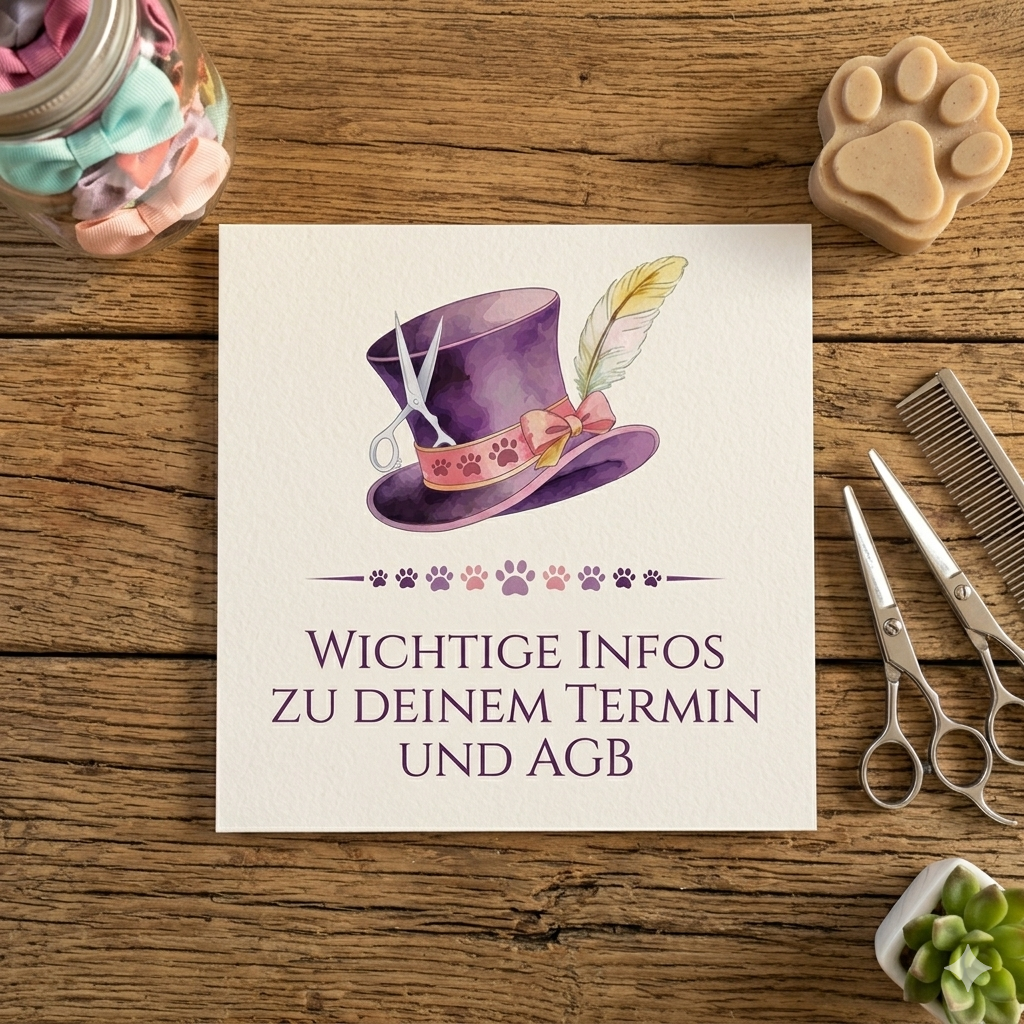 Bitte informiere mich vorab über Allergien oder Krankheiten. Prüfe deinen Hund direkt nach dem Schnitt – spätere Reklamationen können nicht berücksichtigt werden. Für unvorhersehbare gesundheitliche Ereignisse (ohne Verschulden des Salons) übernehme ich keine Haftung.